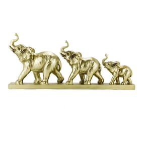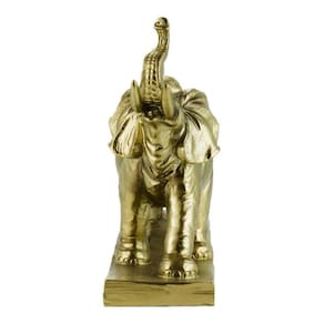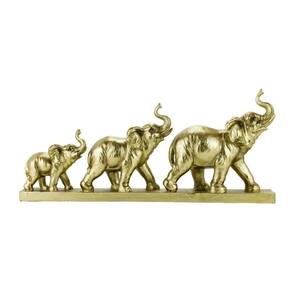 Enfeite decorativo no formato de um elefante em captura de crescimento. Peça com 21,5 cm de altura e 47 cm de largura na cor dourada. Detalhes realistas. Material: resina.