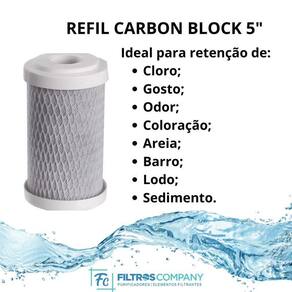 Elemento filtrante carbon block de 5 polegadas para remoção de cloro, gostos e odores. Ideal para uso em chuveiros, pias e torneiras.