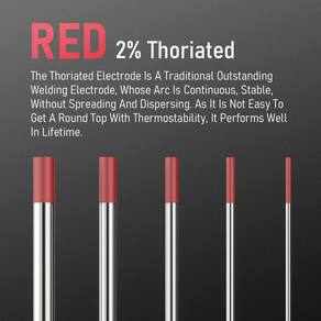 Eletrodo de tungstênio de soldagem TIG 2% Thoriated 1/16" x 7" (vermelho, EWTh-2) Pacote com 10 YESWELDER - VERMELHO-2% TORIADO: O eletrodo Thoriated é um eletrodo de soldagem tradicional excepcional, cujo arco é contínuo, estável, sem se espalhar e dispersar. Como não é fácil obter um topo redondo com termoestabilidade, ele tem um bom desempenho em uma vida inteira. - Certificação AWS: norma AMERICAN Welding Society AWS A5.12M/A5.12:2009. - DESIGN PERFEITO: Ao verificar a cor da embalagem externa, você pode distinguir rápida e facilmente a cor e o modelo dos eletrodos de tungstênio, economizando seu tempo e reduzindo a possibilidade de erros. - EMBALAGEM PROFISSIONAL: Embalagem a vácuo, sem oxidação, alcançando preservação por muito tempo. - Especificações: Diâmetro: 1/40.6 cm; Comprimento: 18 cm; Quantidade: 10 unidades.