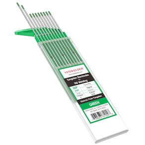 Eletrodo de tungstênio para soldagem TIG, tungstênio puro, 3/81.3 cm x 17.8 cm (verde, EWP) pacote com 10 YESWELDER - TUNGSTÊNIO VERDE-PURO: O eletrodo de tungstênio puro autêntico contém pelo menos 99,5% de tungstênio e oferece todas as propriedades classicamente associadas ao tungstênio - condutividade, durabilidade e desempenho superiores. Serve apenas para soldagem CA em condições de carga pesada. - Certificação AWS: norma AMERICAN Welding Society AWS A5.12M/A5.12:2009. - DESIGN PERFEITO: Ao verificar a cor da embalagem externa, você pode distinguir rápida e facilmente a cor e o modelo dos eletrodos de tungstênio, economizando seu tempo e reduzindo a possibilidade de erros. - EMBALAGEM PROFISSIONAL: Embalagem a vácuo, sem oxidação, alcançando preservação por muito tempo. - Especificações: Diâmetro: 3/81.3 cm; Comprimento: 18 cm; Quantidade: 10 unidades.