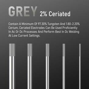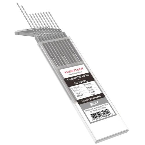 Eletrodo de tungstênio de soldagem TIG 2% Ceriado 1/16" x 7" (cinza, WC20/EWCe-2) pacote com 10 YESWELDER - Cinza-2% ceriado: contém um mínimo de 97,30% tungstênio e 1,80-2,20% de cério, eletrodos ceriados podem ser utilizados proficientemente em processos AC ou DC e têm melhor desempenho em soldagem CC em configurações de baixa corrente. - Certificação AWS: norma AMERICAN Welding Society AWS A5.12M/A5.12:2009. - DESIGN PERFEITO: Ao verificar a cor da embalagem externa, você pode distinguir rápida e facilmente a cor e o modelo dos eletrodos de tungstênio, economizando seu tempo e reduzindo a possibilidade de erros. - EMBALAGEM PROFISSIONAL: Embalagem a vácuo, sem oxidação, alcançando preservação por muito tempo. - Especificações: Diâmetro: 1/40.6 cm; Comprimento: 18 cm; Quantidade: 10 unidades.