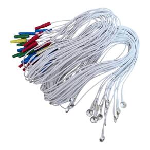 Características: - eletrodo para eeg exames de eletroencefalografia. - eletrodo de disco/cúpula ouro 10mm - fios de kevlar, alta resistência. - pinos fêmeas coloridos para fácil identificação de posicionamento. - aplicação adulto e infantil Embalagem: kit com 25 eletrodos de 1,50m cada fio.