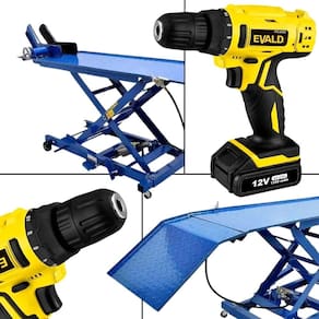 Elevador Hidráulico para Motos 350KG e Parafusadeira e Furadeira à Bateria 12V e Kit EVALD