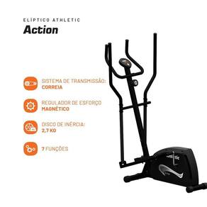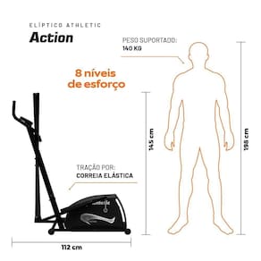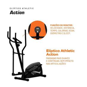 Especificações TécnicasProduto: Elíptico Athletic ActionCódigo do Fabricante: 03888Marca: AthleticModelo: Athletic ActionLinha: ResidencialIndicado para Uso: ResidencialRegulador de Esforço: Magnético (sem atrito)Níveis de Esforço: 8 níveisDisco de Inércia: 2,7 kgSistema de Transmissão: CorreiaFunções do Monitor: 7 Funções (Velocidade, Distância, Tempo, Calorias, Odômetro, Scan, Sleep)Sensor de Batimentos Cardíacos: Sim (Sistema Hand Grip)Sapata: Antideslizante com cravosPegadores: ErgonômicosPeso Máximo Suportado pelo Usuário: 140 kgDisplay: LCDSegurança: Pés com estabilidade, Nivelador de pisoTamanho: ÚnicoCor: PretoEstrutura: Aço carbonoPintura: Eletrostática a póDimensões Aproximadas Montada (A x L x C): 145 x 70 x 112,5 cmPeso Líquido: 26 kgComposição: Aço e plásticoCircunferência da Passada: 26,4 cmCuidados com o Produto: Limpeza com pano úmidoGarantia: 1 ano (consultar manual)Itens Inclusos: 1 Elíptico, 1 Manual do Usuário, 1 Kit de MontagemAlimentação do Monitor: Duas pilhas AAAUso de Energia: Dispensa energia elétrica (apenas monitor usa pilhas)Estado do Produto: NovoGênero: UnissexMontagem: Fácil (Sistema Easy Fast)Tipo de Exercício: Aeróbico, Condicionamento Físico, Resistência, , HIIT, Fortalecimento MuscularPartes do Corpo Trabalhadas: Glúteos, Quadríceps, Tríceps Sural, Músculos das Costas, Lombares e AbdominaisQuantidade de Exercícios: 2 (simula caminhadas planas e subidas)