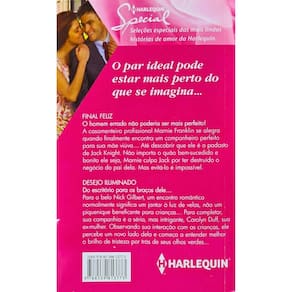 Sinopse O homem errado não poderia ser mais perfeito! A casamenteira profissional Marnie Franklin se alegra quando finalmente encontra um companheiro perfeito para sua mãe viúva… Até descobrir que ele é o padrasto de Jack Knight. Não importa o quão bem-sucedido e bonito ele seja, Marnie culpa Jack por ter destruído o negócio do pai dela. Mas evitá-lo é impossível. Desejo Iluminado Do escritório para os braços dele… Para o belo Nick Gilbert, um encontro romântico normalmente significa um jantar à luz de velas, não um piquenique beneficente para crianças… Para completar, sua companhia é a séria, mas intrigante, Carolyn Duff, sua ex-mulher. Observando sua interação com as crianças, ele percebe um novo lado dela e começa a entender melhor o brilho de tristeza por trás de seus olhos verdes.