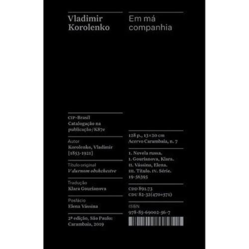 Em má companhia – memórias de infância de um amigo meu é um dos livros essenciais para conhecer melhor a obra de Vladimir Korolenko (1853–1921), considerado por Liev Tolstói “um dos principais contistas da literatura de língua russa” e comparado a Charles Dickens pelo crítico Otto Maria Carpeaux. Korolenko nasceu no sudeste do Império Russo, em Jitómir, atual Ucrânia – uma região multicultural, que passou pelo domínio russo, polonês e ucraniano, onde ele situa essas duas novelas. Com 20 anos, foi estudar em Moscou, onde se envolveu com movimentos estudantis – o que lhe rendeu uma deportação para a Sibéria. Foi lá, durante o exílio, que começou a escrever. Preocupado em denunciar injustiças sociais e sofrimentos humanos, o escritor é considerado um precursor da literatura proletária. Chamado por seus contemporâneos de “consciência de nossa época”, obteve tanto a aceitação popular como a dos meios intelectuais. Em má companhia – memórias de infância de um amigo meu retrata a amizade de um garoto, filho de um juiz rico, que se envolve com uma turma de meninos de outro estrato social. Por meio dessa amizade, o autor aborda sentimentos básicos de compaixão e compartilhamento, temas que sempre estiveram presentes em seus textos. O design da coleção é assinado pelo Bloco Gráfico, constituído por Gabriela Castro, Gustavo Marchetti e Paulo André Chagas. Os livros têm acabamento em brochura, formato 13x20 cm, e utilizam papéis especiais e certificados: o sueco Munken Print Cream 80 g/m2 no miolo e o escocês Pop Set Black 320 g/m2 na capa. Outro detalhe do volume é a inclusão de um fitilho bordado com o logo do Acervo. Marca: Não Informado