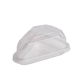 A embalagem D-630 da marca Dona Rita é uma embalagem plástica triangular feita de PET transparente, utilizada para acomodar e transportar fatias individuais de bolos, tortas e outras sobremesas. Ela oferece alta visibilidade do produto, tem um fechamento seguro que garante vedação contra contaminações e vazamentos, proporcionando praticidade e uma apresentação profissional para o alimento.