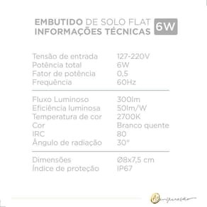Tensão de entrada:127-220V Potência total: 6W Fator de potência: 0,5 Frequência: 60Hz Fluxo luminoso: 300lm Eficiência luminosa: 50lm/W Temperatura de cor: 2700K Cor: Branco Quente IRC: 80 Ngulo de radiação 30 Dimensões: 8x7,5 cm Índice de proteção: IP67 Ean: 7908163127561