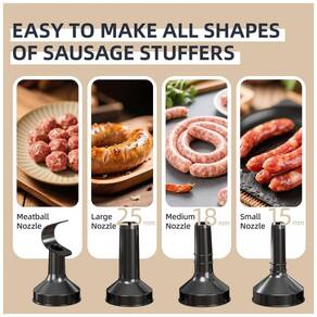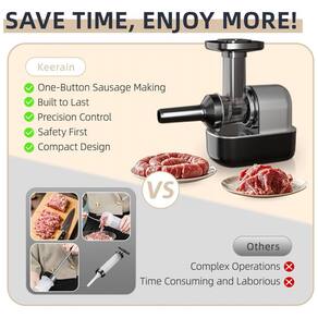 Design Inovador, Fácil de Operar Embutidora Elétrica Keerain possui um design amigável que permite a operação por uma única pessoa de forma fácil. Basta colocar a carne no tubo de alimentação, e o motor de cobre combinado com uma estrutura espiral empurra automaticamente a carne, criando linguiças perfeitamente moldadas todas as vezes. Opções de Tubulação Versáteis Esta Máquina Automática de Encher Carne vem com três tamanhos diferentes de tubos de enchimento e uma cabeça dedicada para almôndegas, proporcionando a flexibilidade para fazer uma variedade de linguiças e almôndegas, desde cachorros-quentes até chorizos gourmet. O design alongado dos tubos evita que as carcaças escorreguem durante o processo de enchimento. Fácil de Iniciar sem Muito Pré-Processamento Simplifique sua preparação com nossa estrutura inovadora que permite picar a carne fresca em pequenos pedaços. O mecanismo espiral processa efetivamente a carne no tamanho ideal para a carcaça, garantindo que os sabores e sucos naturais sejam preservados para deliciosas linguiças caseiras. Ferramenta de Cozinha Multiuso Ideal para criar uma ampla gama de produtos de carne, a Embutidora Elétrica é perfeita para fazer linguiças caseiras, hambúrgueres e outras delícias. Seja utilizando carne bovina, frango ou até mesmo carnes de caça como veado, esta máquina foi projetada para entusiastas da cozinha caseira. Fácil de Limpar e Armazenar O compartimento de picar pode ser facilmente removido para ser enxaguado sob água corrente, facilitando a limpeza. Um pequeno pincel está incluído para garantir uma limpeza completa em áreas de difícil acesso, enquanto seu design compacto economiza espaço de armazenamento valioso.