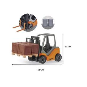 Indicado para crianças à partir de 03 anos; Além da empilhadeira, na embalagem contem, 1 pallet, 4 caixinhas e dois tambores; Produzido em plástico e material emborrachado; Comprimento considerando o garfo 18 cm