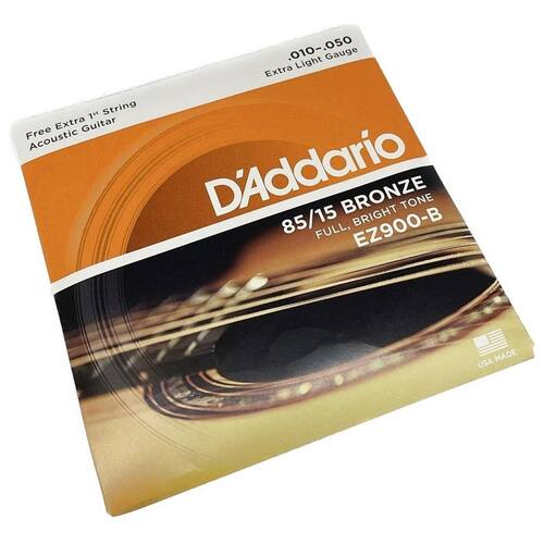 Encordoamento 010 Aço Bronze Daddario 10-50 Violão EZ900-B Jogo de Cordas para violão + 1 corda extra A linha de cordas de aço D'Addario vão te surpreender com o brilho no som, sustain e durabilidade. Proporcionam um timbre perfeito Utilizado por músicos em todo o mundo - Modelo EZ 900-B - Tensão Extra Light - Contém 6 cordas de aço + 1 extra - Presas com bolinhas coloridas Marca: Daddario (autêntico)