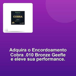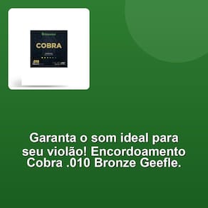 O que nos distingue é a nossa paixão pela excelência. Cada membro da nossa equipe compartilha o mesmo objetivo: proporcionar a você produtos que você possa confiar e se orgulhar de utilizar. Acreditamos que a qualidade não é apenas uma característica, mas um reflexo do nosso compromisso com a satisfação de nossos clientes. Desfrute do som perfeito com o Encordoamento Para Violão Aço Cobra Bronze .010 - Geefle. Fabricado no Brasil com a alma de aço e revestimento de bronze 85/15, garantindo uma sonoridade rica e completa. O acabamento em bolinha proporciona uma sensação agradável ao tocar.