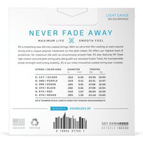 Instrumento Recomendado:Violão Aço Linha:XS 80/20 Bronze Unidades por embalagem:3 Quantidade de cordas:6 Calibres:0.012, 0.016, 0.024, 0.032, 0.042, 0.053 Materiais:Aço/Bronze Tensão:Leve Notas:E, B, G, D, A, E Escala:N/A Origem:Estados Unidos Gênero:Unissex