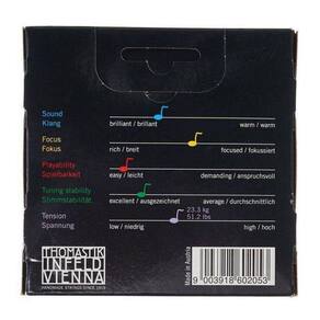 A primeira corda, Mi e , é feita de aço com banho de platina, proporcionando um timbre brilhante e vibrante. A segunda corda, La a , possui núcleo sintético com revestimento em alumínio, oferecendo um som suave e encorpado. A terceira corda, Re d , também possui núcleo sintético, porém com revestimento em prata, proporcionando um som rico em harmônicos. Por fim, a quarta corda, Sol g , possui núcleo sintético com revestimento em prata, garantindo um som encorpado e profundo.