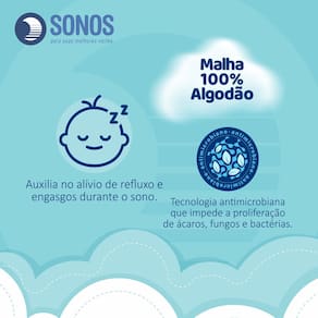 Sabemos o quanto o sono é essencial para o desenvolvimento saudável do bebê e para a tranquilidade de toda mãe. Pensando nisso, a Sonos desenvolveu o Encosto para Bebê com 8 cm de altura: um apoio firme, seguro e com inclinação leve, que auxilia no alívio de refluxo e engasgos durante o sono, proporcionando mais conforto e bem-estar para o bebê, e mais paz para você.