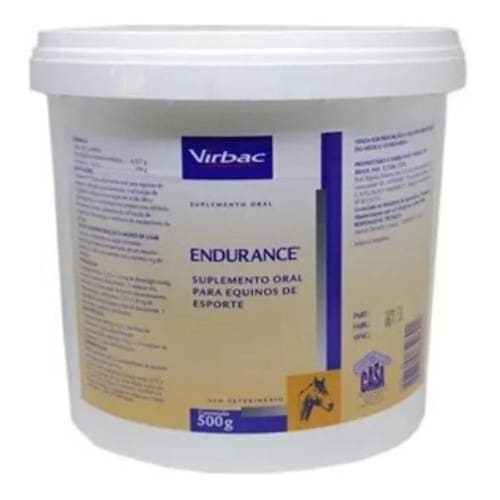 Endurance é um suplemento oral para Equinos de esporte, indicado para aumentar a utilização de oxigênio e reduzir a formação de ácido lático pós-exercício. A dimetilglicina proporciona estímulo do sistema imune, aumento da utilização de oxigênio e de energia e melhoria do metabolismo da glicose.FórmulaCada 100g contém:Dimetilglicina hidrocloridrato ...................6,521 gExcipiente..........Q.S.P..................................100,0 gVia de Administração e Modo de usarUso oral, misturado à ração alimentar. Endurance vem acompanhado de um dosador plástico, onde cada medida única fornece 4 g de produto.PosologiaPosologia básica: 1,25 a 1,8 mg de dimetilglicina/kg de peso corporal, diariamente, 2 vezes ao dia, durante 3 a 4 dias antes de exercícios extenuantes.Pós Exercício, administrar 1,25 a 1,8 mg de dimetilglicina/kg de peso corporal, diariamente, 1 vez ao dia, conforme necessário.Dose PráticaEquinos até 400 kg: 8 g 2 medidas de Endurance a cada administração.Equinos de 400 a 600 kg: 12 g 3 a 4 medidas de Endurance a cada administração.Fabricante: Virbac