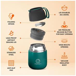 MANTENHA OS ALIMENTOS QUENTES OU FRIOS FRESCO Não importa a refeição, conte com a tecnologia de isolamento a vácuo da Energify À PROVA DE VAZAMENTO E CONFIÁVEL Hermético e fácil de abrir, seus frascos de zenamento não vazarão em sua lancheira MATERIAIS DE QUALIDADE ALIMENTAR Mantenha os alimentos s com aço inoxidável, silicone e plástico sem BPA. GRAB N GO GOODIES Coma facilmente em qualquer lugar com sua garrafa térmica, colher dobrável e estojo de transporte Marca: Não Informado