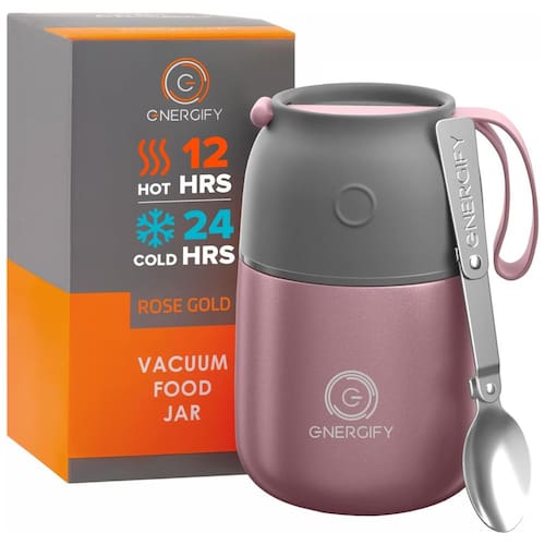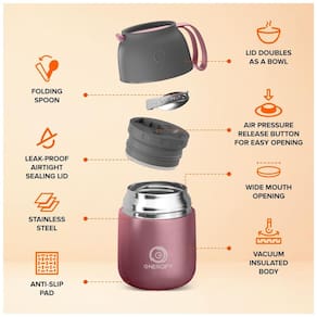 MANTENHA OS ALIMENTOS QUENTES OU FRIOS FRESCO Não importa a refeição, conte com a tecnologia de isolamento a vácuo da Energify À PROVA DE VAZAMENTO E CONFIÁVEL Hermético e fácil de abrir, seus frascos de zenamento não vazarão em sua lancheira MATERIAIS DE QUALIDADE ALIMENTAR Mantenha os alimentos s com aço inoxidável, silicone e plástico sem BPA. GRAB N GO GOODIES Coma facilmente em qualquer lugar com sua garrafa térmica, colher dobrável e estojo de transporte Marca: Não Informado
