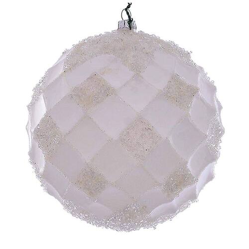 Bola branca com miçangas Vickerman de 4,75". Este item apresenta um padrão de rede de glitter com miçangas transparentes para adicionar textura a qualquer projeto de decoração natalina, bem como uma tampa segura perfurada e com arame para pendurar de forma confiável. Este ornamento exclusivo é um complemento excepcional