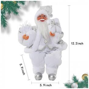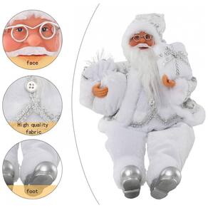 Este adorável Papai Noel sentado é vestido com um elegante casaco branco e prata, acompanhado de um chapéu bem trabalhado, segurando uma bolsa de presente e um presente. Extremamente fofo e chique, ele cria uma forte atmosfera festiva de Natal. Perfeito para decorar lareiras, mesas, estantes e outros locais elevados. Encante-se ao vê-lo sentado no topo, protegendo a casa ao redor de uma calorosa lareira. Feito de plástico e tecido de alta qualidade, durável e seguro, este Papai Noel é uma ótima opção de presente para familiares e amigos, trazendo boa sorte, felicidade e calor. Com 30cm de comprimento, incluindo as pernas, é perfeito para enfeitar mesas, exibições em janelas, árvores de Natal ou qualquer outro lugar como um adorno natalino.