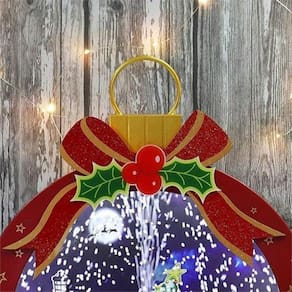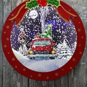 O enfeite em formato de bola natalina, traz em seu interior um carro com pinheiro Iluminado por luzes led sob queda de cascatas de neve