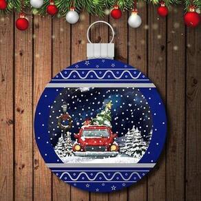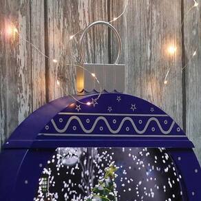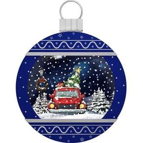 O enfeite em formato de bola natalina, traz em seu interior um carro com pinheiro Iluminado por luzes led sob queda de cascatas de neve