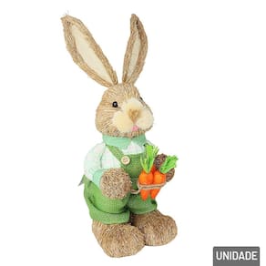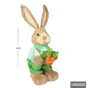 Enfeite de Páscoa Coelho de Palha com Cenour O Enfeite de Páscoa Coelho de Palha Decorado carregando Cenoura em sua Pata, é uma peça encantadora que traz todo o charme e a alegria da Páscoa para sua decoração. Com 45cm de comprimento, este Enfeite combina o tradicional com o lúdico, criando uma atmosfera acolhedora e divertida para o seu lar durante as festividades.\nO coelho de palha é cuidadosamente confeccionado com materiais naturais, proporcionando um visual rústico e charmoso, típico de decorações de Páscoa mais aconchegantes.\nO coelho é vestido com roupinhas delicadas e apresenta uma expressão adorável, transmitindo a doçura e a leveza da celebração. Ele é ideal para decorar diferentes ambientes da sua casa, como a entrada, estantes, mesas ou prateleiras, e com seu tamanho generoso, chama a atenção de forma encantadora, sendo um verdadeiro destaque na sua decoração de Páscoa.\nDisponível em cores.\nEspecificações:\nMarca : TINGS\nTipo de material : Fibra Natural, Isopor, Palha, Poliéster\nCores ou Estampa : Color\nDimensões do Produto : 45 X 18 X 14 CM\nDimensões da Embalagem : 45 X 18 X 14 CM\nPeso Bruto (Gramas) : 0.180 Marca: Não Informado