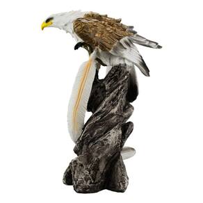 Enfeite decorativo no formato de uma águia em cima da rocha decorado com uma pena longa. Peça com 24.5 cm de altura e 13 cm de largura. Cores realista. Material: resina