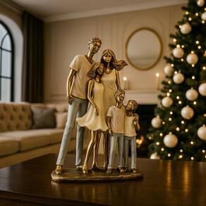Habilmente esculpida em resina de alta qualidade, a estátua retrata uma família em uma pose acolhedora, transmitindo serenidade e o forte vínculo que os une. Os tons neutros se complementam com o dourado em detalhes sutis, conferindo à peça um visual elegante e atemporal, permitindo que ela se integre harmoniosamente a diversos estilos de decoração, do minimalista ao escandinavo. A paleta suave e os toques brilhantes expressam a pureza e a beleza dos laços familiares.