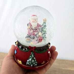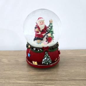 ;Globinho de NATAL MUSICAL a corda com neve artificial, uma ótima opção para sobrepor um móvel, colocar junto a árvore de natal, naquele cantinho especial, em seu comércio ou onde seu bom gosto mandar. A base que sustenta o globo é confeccionada em resina, o globo em vidro com água e glitter que simula neve e 1 PAPAI NOEL com árvore e crinaça em resina, (chacoalhando o globo, o glitter se mistura com a água simulando neve) detalhe que dará um destaque a mais em toda a peça e um charme ao seu ambiente. Confeccionadas em resina, material esse com maior resistência e riqueza de detalhes assim como a pintura de excelente qualidade, perfeito!