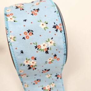Enfeite Páscoa Fita Aramada Azul Floral 6cmx9m Fita Aramada Azul com flores para Páscoa e festas
