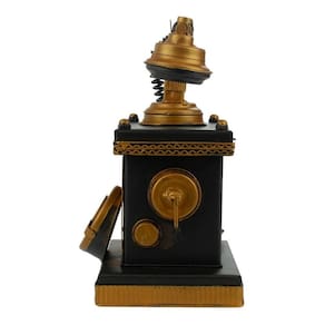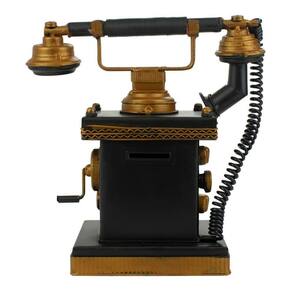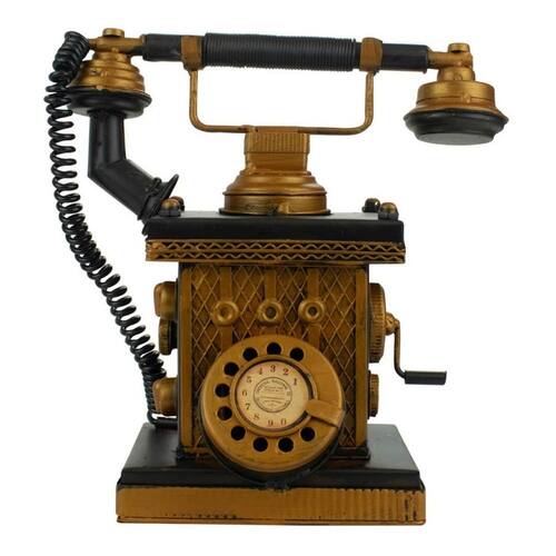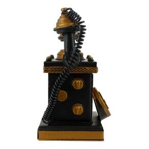 Enfeite decorativo em forma de um telefone preto antigo com 23 x 12,5 x 23 cm de dimensão, detalhes e cores muito realista. É também um cofrinho porta moedas. Material: metal; Atenção: este produto tem apenas função decorativa, não é um brinquedo e nem um telefone de verdade!
