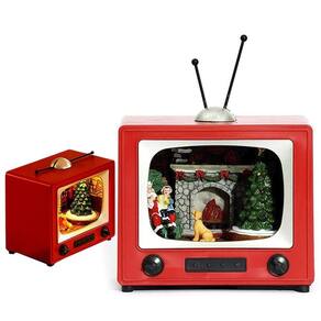 A tv mostra um lindo cenário com um papai noel e uma criança sentados em uma cadeira. E um cachorrinho fofo completando essa cena de amor e aconchego.