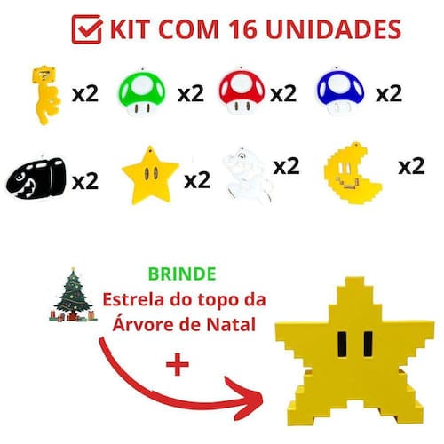 1. Quantos enfeites vêm no kit? R: O kit contém 16 enfeites temáticos do Mario Bros.