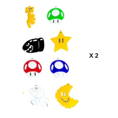 Especificações técnicas: - Kit com 16 enfeites de árvore de Natal temáticos do Mario Bros. - Confeccionados em acrílico com acabamento em máquina laser. - Enfeites do Mario Bros: cogumelos super e estrelas de poder. - Medidas dos enfeites: [inserir medidas aqui]. - Instruções de lavagem: pano úmido com água e sabão neutro. - Não acompanha amarrilhos para amarração em sua árvore de Natal. - Não acompanha a árvore de Natal.