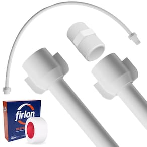 Engate mangueira flexível para descarga 40cm x 1/2 branco + fita veda rosca Engate mangueira flexível para descarga 40cm x 1/2 branco astra Um engate flexível para descarga é um dispositivo para conectar um cano de esgoto ou uma mangueira de descarga a uma fonte de escoamento, como uma pia, banheira ou vaso sanitário. Ele é projetado para ser flexível, permitindo que ele se dobre e se mova sem quebrar ou vazar. O engate flexível é uma alternativa conveniente e eficaz aos tubos de esgoto rígidos, especialmente em situações onde a instalação de um cano rígido não é viável devido à falta de espaço ou à dificuldade de manobra. Além disso, o engate flexível pode ser facilmente removido e substituído, o que o torna uma opção popular para instalações temporárias ou em reformas de banheiros e cozinhas. Especificações técnicas Material: pvc flexível Temperatura indicada: somente água fria Pressão: 40 m.C.A Diâmetro: 1/2 Tipo de corpo: macho-fêmea e fêmea-fêmea Cor: branco Acabamento: brilhante do fabricante: 90 dias Fita veda rosca teflon 12mm x 5m firlon Fita veda rosca teflon firlon é produzida pela plastifluor que líder de produção para o mercado brasileiro. Produto com excelência em qualidade, supera a norma abnt nbr 16368:2015. Especificações técnica Composição química: ptfe poli-tetra-fluor-etileno . Aplicação: vedação de roscas e conexões em tubulações de água fria, água quente, vapor, combustíveis, fluidos e gases em geral. Temperatura de trabalho: de - 90c até +240c. Resistência química: material de baixíssima reatividade química, resistente aos líquidos e gases comumente utilizados em instalações industriais como: ácidos, bases, solventes, combustíveis, lubrificantes, vapor, gases de processo etc. Compatibilidade com oxigênio: compatível com oxigênio líquido ou gasoso em temperatura ambiente e criogênicas. Consultar quanto ao uso acima de 50c. Tolerâncias dimensionais: sempre maior ou igual que a espessura e densidade mínima. Marca: firlon Fabricante: plastifluor Comprimento: 5 metros Largura: 12 milímetros O produto segue montado e pronto para instalação - 90 dias para todo e qualquer vício ou defeito aparente ou que não estejam em conformidade com o produto. Especificações técnicas Material: pvc flexível Temperatura indicada: somente água fria Pressão: 40 m.C.A Diâmetro: 1/2 Tipo de corpo: macho-fêmea e fêmea-fêmea Cor: preto Acabamento: brilhante do fabricante: 90 dias Itens inclusos 01 engate flexível 01 niple 01 rolo de fita veda rosca 12mm x 5m Marca: Não Informado