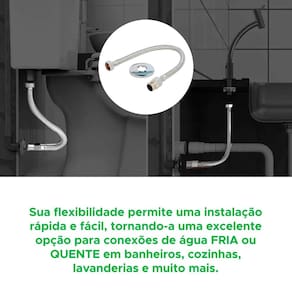 O engate mangueira flexível trançado aço pode ser utilizado em sua residência ou comércio, o engate flexível é um equipamento que não pode faltar na cozinha, banheiro ou lavanderia. Sua utilização é essencial para a ligação entre a rede hidráulica e a torneira, ou até mesmo na caixa acoplada, produzido em aço, possui grande resistência para alta pressão, e por ser flexível, adapta-se a qualquer tipo de instalação com muita facilidade.