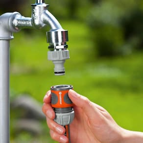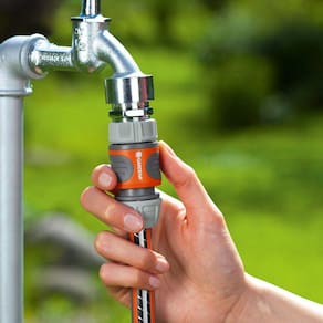 A mangueira de jardim pode ser facilmente ligada à torneira. A Ligação de Mangueira está protegida por um anel de borracha que evita danos.