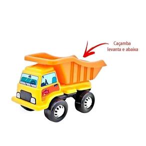 Inclui caminhão com caçamba móvel, trator com pá e braço articulados que levantam/abaixam via manivelas, além de acessórios como capacete de segurança, cones e ferramentas, tudo em plástico resistente e colorido (dimensões aproximadas: 45x30x25 cm).