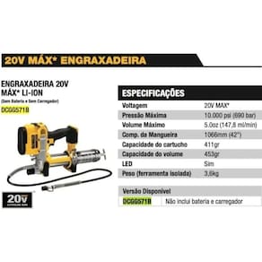 CARACTERÍSTICAS Válvula para purgar o ar melhora o funcionamento da bomba; Luz LED controle de velocidade variável oferece iluminação em ambientes de trabalho escuros; Bomba de alto volume até 147,8 g/min; Motor potente fornece no maximo 10000 psi; Controle de velocidade variável; Filtro da bomba evita que o pó e a sujeira obstruam o mecanismo da bomba. ESPECIFICAÇÕES TÉCNICAS :: Pressão de saída: 590 bar :: Pressão de saída: 10.000 PSI :: Taxa de alimentação: 147 g / min :: Tipo de graxa até: NLGI 2 :: Capacidade de graxa: Bulk 453g :: Capacidade de graxa cartucho : 400g :: Comprimento da mangueira: 1000mm :: Luz de led: Sim :: Peso: 3,6Kg CONTEÚDO Ferramenta de aplicação Engraxadeira Alça de Ombro - De Fábrica: 3 Anos