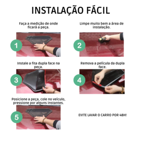 Características: - Entrada de ar funcional; - Para o uso decorativo, nenhuma ferramenta ou perfuração é necessária; - Fácil de instalar e uso durável;- Excelente qualidade e fácil instalação; - Ótima decoração e adequada para a maioria dos veículos; - Aplicação é feita com fitas adesivas dupla face fortes; - Produto leve e com alto desempenho.