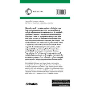 Entre o Passado e o Futuro é, entre os livros de Hannah Arendt, aquele que faz pulsar simultaneamente o conjunto de inquietações a partir do qual essa admirável representante da cultura de Weimar ilumina, para usar uma de suas palavras prediletas, o discurso político do século XX. Ele contém praticamente todo o temário de sua obra, constituindo-se, portanto, num ponto de partida por excelência de toda a tentativa de interpretação e organização do seu pensamento. QUARTA-CAPA Hannah Arendt é uma das maiores referências para interpretarmos nossa época por sua capacidade de refletir politicamente acerca da natureza da sociedade moderna. Conceitos e temas como os de autoridade, liberdade, violência, o propósito e a importância da educação, as crises da democracia e o autoritarismo, são trazidos ao escrutínio e debatidos pela filósofa. Esta coletânea reúne oito “exercícios de pensamento” sobre a crise da modernidade e sobre o que Arendt chama de perda de sentido de noções como justiça, razão, responsabilidade, virtude e glória. Com erudição e sensibilidade ímpares, seu pensamento ilumina a “experiência viva” sobre a qual se ergue, pois Arendt nada tinha de saudosista ou de utópica: é a respeito do presente, esse tempo Entre o Passado e o Futuro, que ela pensa, o único tempo que podemos realmente mudar.