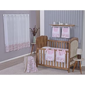 Contém na embalagem: 1 lençol com elástico 1,30m comp x 0,70m larg x 0,15m alt 1 lençol sem elástico 1,35m comp x 1,05m larg 1 fronha 40cm comp x 30cm larg 1 manta dupla face 1,15m comp x 0,95m larg manta de microfibra na cor bege de um lado e tecido de algodão do outro 2 porta fraldas 43cm alt x 32cm larg x 10cm prof para ser pendurado em varão em móveis ou na parede 2 porta fraldas com laço 38cm alt x 32cm larg x 10cm prof para ser pendurado em varão ou no berço 1 cortina 2,70m larg x 1,60 alt 2 partes de 1,35m larg