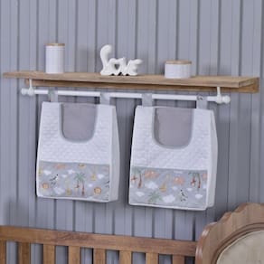 Contém na embalagem: 1 lençol com elástico 1,30m comp x 0,70m larg x 0,15m alt 1 lençol sem elástico 1,35m comp x 1,05m larg 1 fronha 40cm comp x 30cm larg 1 manta dupla face 1,15m comp x 0,95m larg manta de microfibra na cor bege de um lado e tecido de algodão do outro 2 porta fraldas 43cm alt x 32cm larg x 10cm prof para ser pendurado em varão em móveis ou na parede 1 cortina 2,70m larg x 1,60 alt 2 partes de 1,35m larg