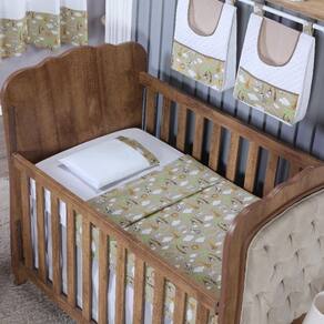 Contém na embalagem: 1 lençol com elástico 1,30m comp x 0,70m larg x 0,15m alt 1 lençol sem elástico 1,35m comp x 1,05m larg 1 fronha 40cm comp x 30cm larg 1 manta dupla face 1,15m comp x 0,95m larg manta de microfibra na cor bege de um lado e tecido de algodão do outro 2 porta fraldas 43cm alt x 32cm larg x 10cm prof para ser pendurado em varão em móveis ou na parede 1 porta treco 64cm larg x 54cm alt para ser pendurado em varão ou no berço 1 cortina 2,70m larg x 1,60 alt 2 partes de 1,35m larg