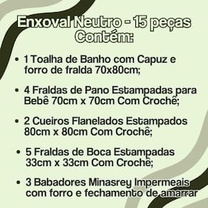 Especificações do Kit NEUTRO: Total de Produtos: 15 Peças Contém 1 Toalha de Banho com Capuz e forro de fralda 70x80cm Contém 4 Fraldas de Pano Estampadas para Bebê 70cm x 70cm Com Crochê Contém 2 Cueiros Flanelados Estampados para Bebês 80cm x 80cm Com Crochê Contém 5 Fraldas de Boca Estampadas para Bebê 33cm x 33cm Com Crochê Contém 3 Babadores Minasrey Impermeais com forro e fechamento de amarrar