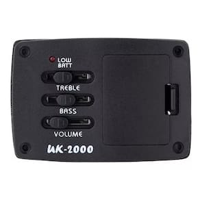 Especificações: Baixo: +/-12db a 100Hz Treble: +/-12dB em 10 KHz Alimentação: 9 V bateria AIkaline Vida Útil da bateria: Mais de 350 horas Pickup: UK-2000 Piezo cabo pick-up Cor do item: Preto Tamanho do artigo: 645 cm/2.41.6 2in Item peso: 58g/2 oz Tamanho do pacote: Aprox. 1176 cm/4.32.8 2.4in Peso da embalagem: 76g/2.7 oz