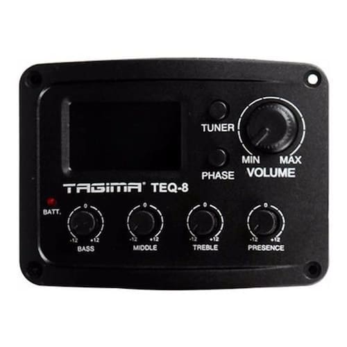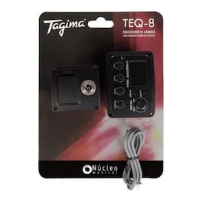 Equalizador Tagima Todos Os Modelos Teq8 _ 5cm x 7cm Pré amplificador, equalizador Afinador cromático digital 4 bandas Grave, médio, agudo e presence Phase, anula efeito de microfonia do violão Painel de LCD Indicador de bateria fraca Captador piezo Battery box com Jack P10 Bateria 9V Utilizado em toda a linha de violões Tagima, com exceção do violão Modena e das linhas Walnut e Canadá Ean: 7898961447445