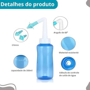 Equipamento nasal premium com lavagem suave e eficaz Descrição do anúncio: Conteúdo da embalagem: 1 higienizador nasal com recipiente de 300 ml 1 bico nasal tamanho adulto 1 bico nasal tamanho infantil Características: Alívio de sintomas como nariz entupido, dores de cabeça, espirros e coriza Facilita a remoção de impurezas e bactérias Hidratante para dias de tempo seco Diminui crises de asma, bronquite e outras alergias Previne amidalite e faringite Combate à otite Reduz dores de cabeça e mal-estar causados pela obstrução nasal Procedimento seguro e recomendado por médicos Especificações: Material: plástico pp Capacidade do recipiente: 300 ml Peso: aprox. 115g Livre de bpa: sim Principais perguntas sobre o produto e respostas: Qual a capacidade do recipiente A capacidade do recipiente é de 300 ml. Pode ser por crianças e adultos Sim, o higienizador nasal é adequado e eficiente tanto para crianças quanto para adultos. Qual é o material do produto O produto é feito de plástico pp e é livre de bpa. Como é feito o procedimento de lavagem O procedimento é indicado com soro fisiológico ou água morna com sal, escolhendo a ponteira adequada, inclinando a cabeça e apertando o botão para iniciar a lavagem. O produto vem com Sim, o produto possui do vendedor de 30 dias. É necessário virar a cabeça para o lado durante a lavagem Não, não é necessário virar a cabeça para o lado, evitando possíveis dores no ouvido. Marca: Não Informado Ean: 7906036489525
