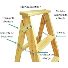 Escada de Madeira Americana com Sapata 5 Degraus - 35 - ESCADAS SEGURANÇA Características:- Nossas escadas são fortes e robustas produzidas de forma a garantir a segurança de quem as utiliza.- Próprias para uso domésticos apta para serviços diversos aonde for necessária.- Toda a madeira é aparelhada e lixada proporcionando um excelente acabamento e qualidade.- Cada degrau suporta até 110 kg de peso total.- Todas as ferragens são galvanizadas, as dobradiças correntes, parafusos e travas de segurança são testadas e aprovadas e de grande durabilidade.- São leves e de fácil manuseio, ideal para as mais diversas utilizações, pinturas, manutenção, eletricidade, limpeza, etc.- Por ser de madeira não conduz eletricidade e por isso ideal para trabalhos com eletricidade.- Fabricadas com madeira de reflorestamento certificada de origem legal são ecologicamente Corretas. Especificações:- Tipo: Escada Americana- Acessórios: Sapata de Borracha, Trava anti abertura, corrente de segurança.- Material: Madeira Pinnus de reflorestamento- Ferragens: Galvanizadas- Montagem: Degraus encaixados, colados e parafusados.- Capacidade: 110 kg- Uso: Chão- Garantia: 90 dias pelo fabricante (defeitos de fabricação)